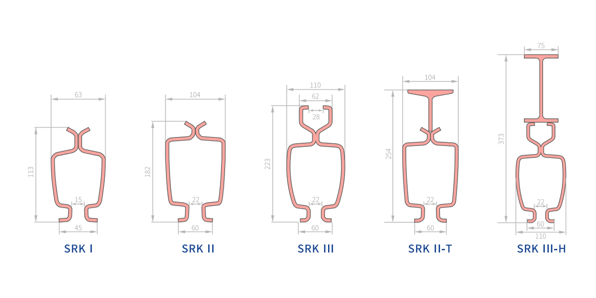| SRK II-T | Yüksek mukavemetli yumuşak çelik | 26,6 kg/m | 33,88cm² | 2380cm⁴ | Sabit raylarla donatılmamış | Aşağıdaki grafik | Özel Boyut | RAL2002 |